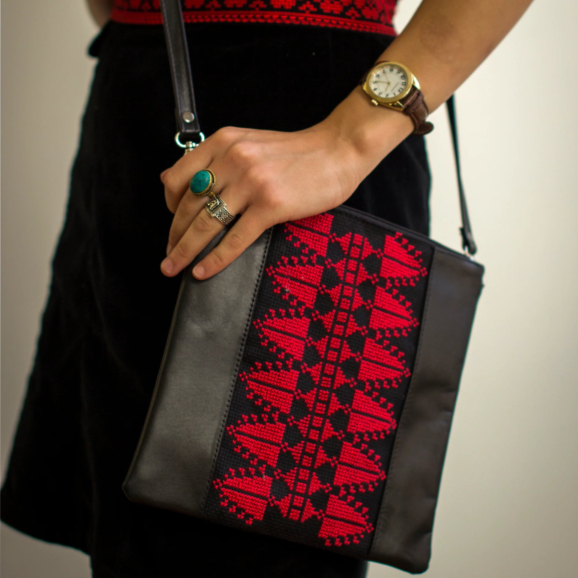 The Cypress Crossbody is a head-turning bag great for carrying the essentials when you leave the house. This crossbody with a splash of color is extremely portable with a long strap to sling over your shoulder or body. The tatreez motif decorating this bag is called "Cypress Tree.”