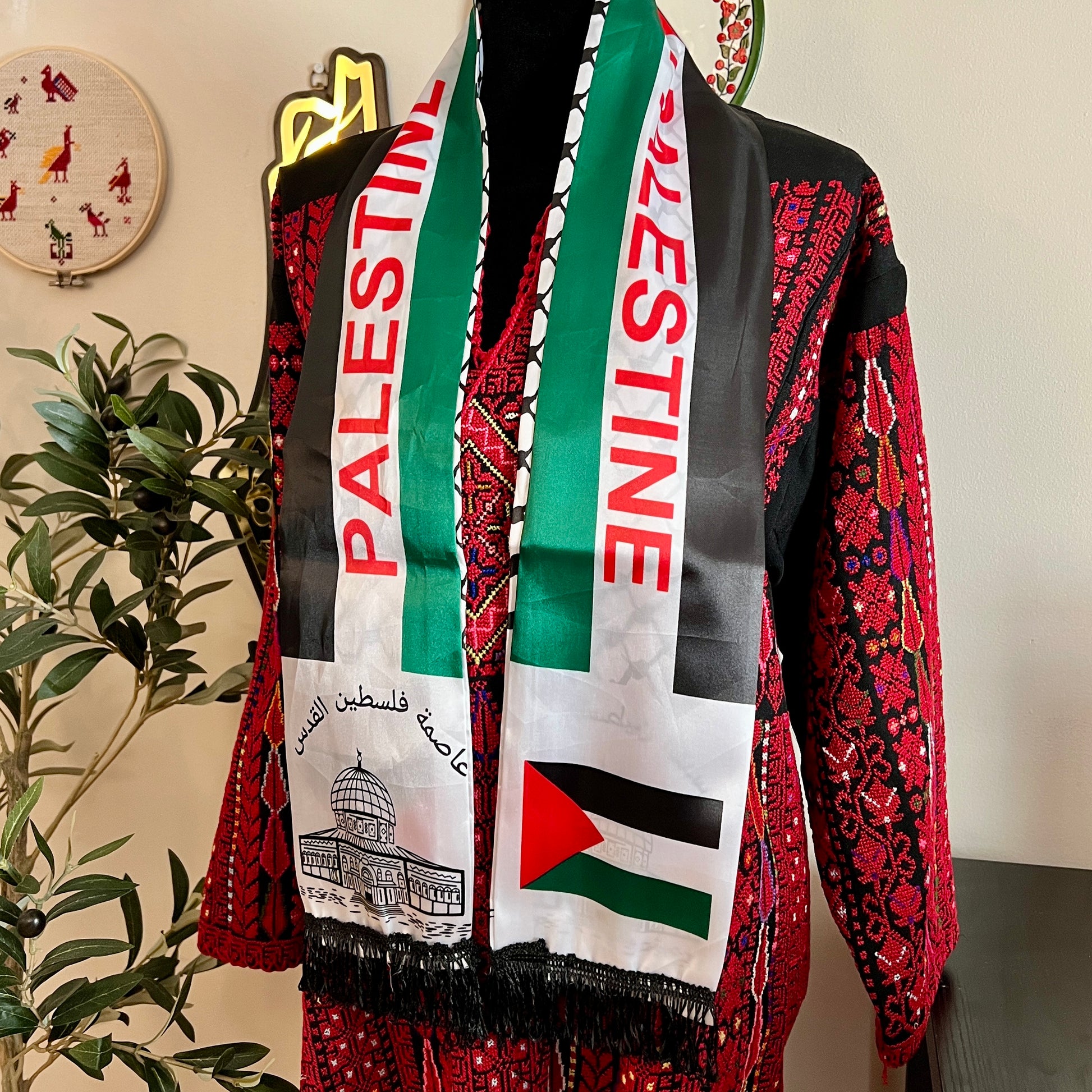 Dual sided Palestine Sash featuring the Palestinian flag, and the dome of the rock.