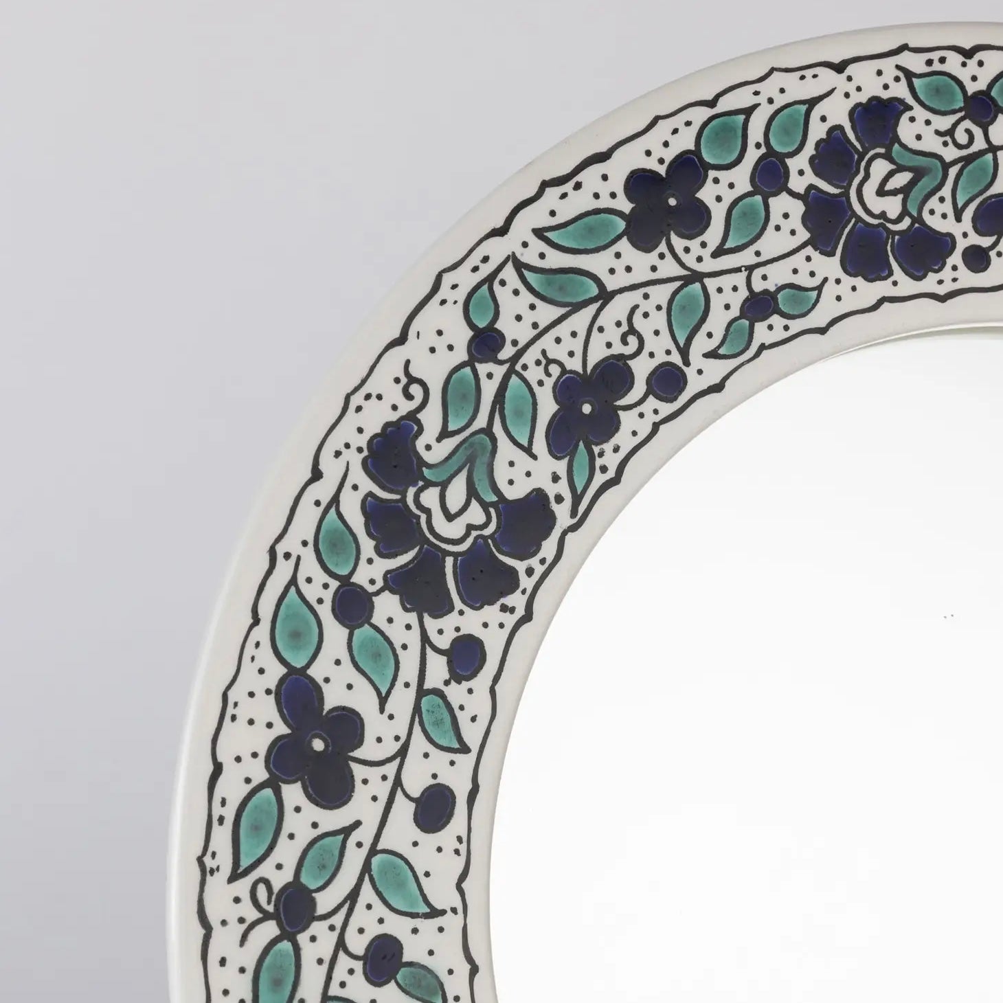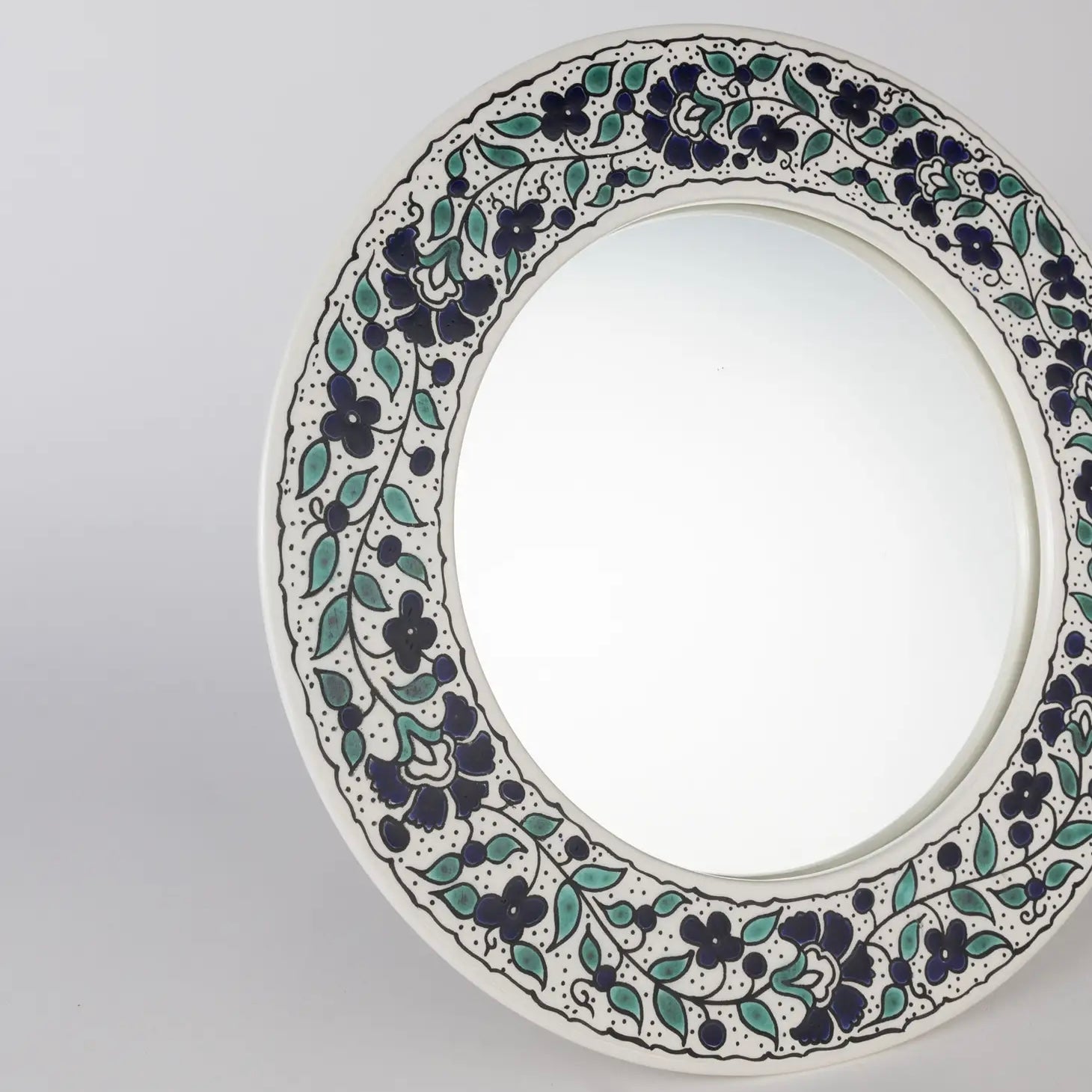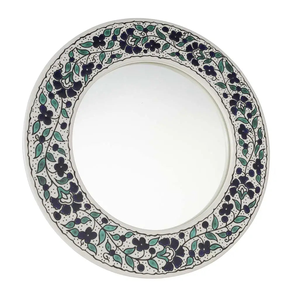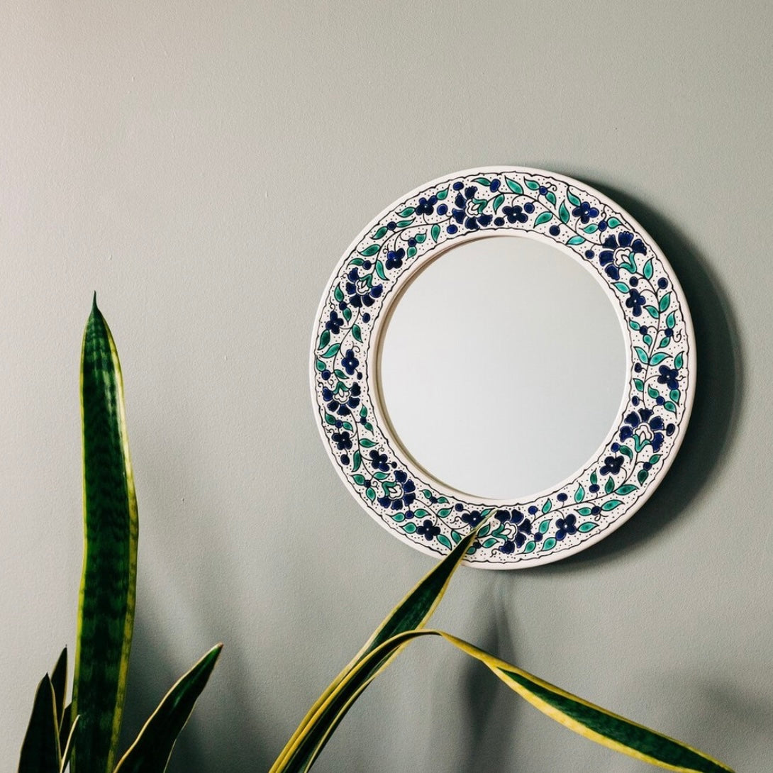 Handcrafted by ceramic artists in Hebron, West Bank, the Blue Floral Round Mirror features a ceramic surround with a hand-painted, blue and green floral motif. A wonderful addition to the powder room, vanity, or gallery wall, the handcrafted details add charm to every space.
