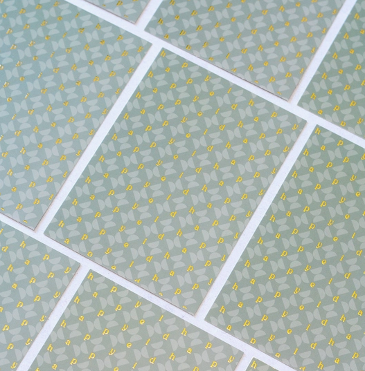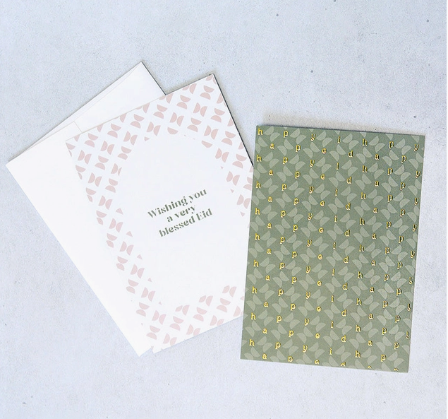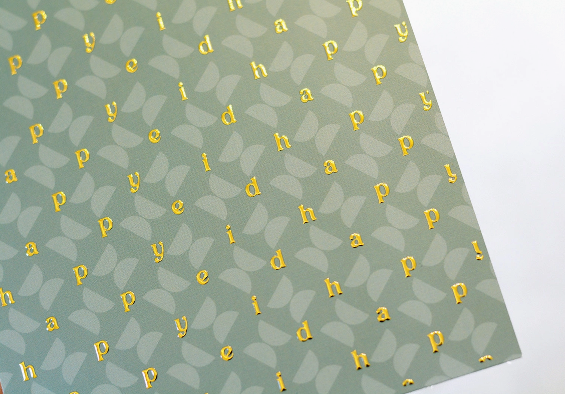 Pictures don't do this beautiful card justice! The repeating "Happy Eid" letters are foiled in brilliant raised gold foil, creating a shimmering raised effect that is countered by the subtle repeating half-moon pattern in sage green.