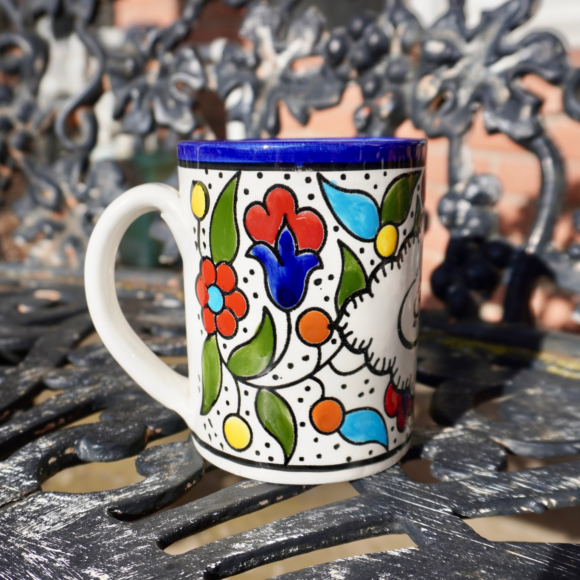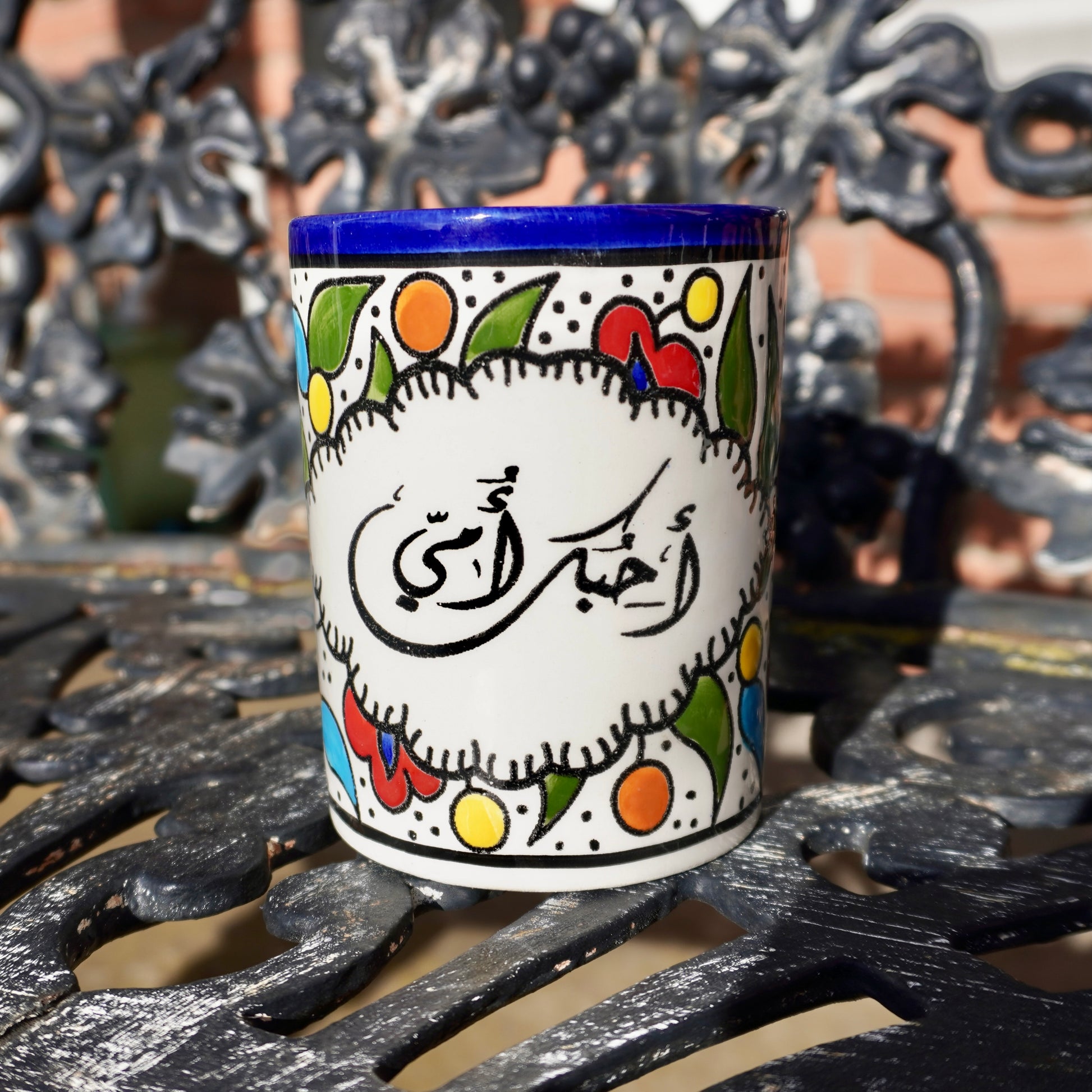 Multicolor floral mug with (احبك أمي) which translates to: I love you, mom.