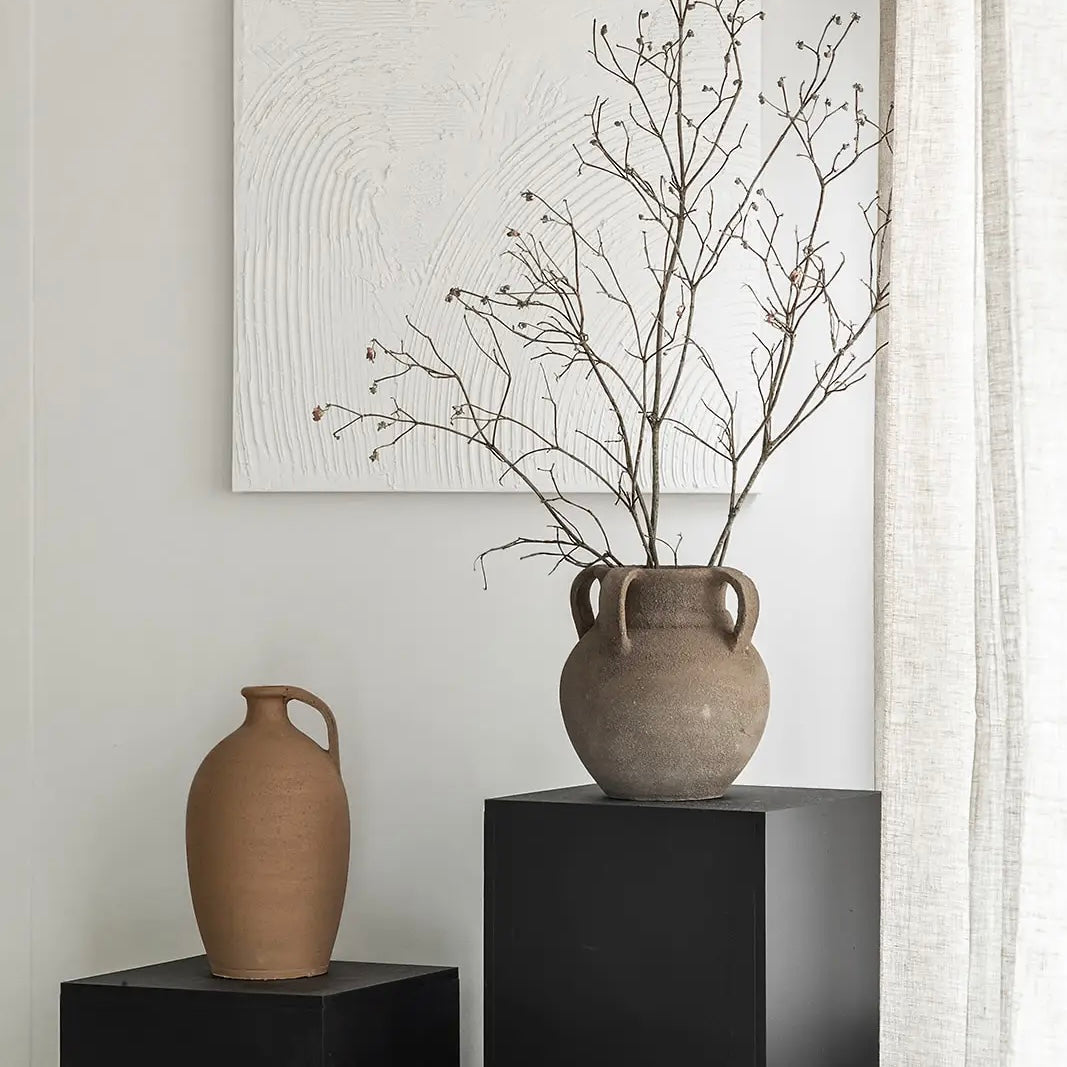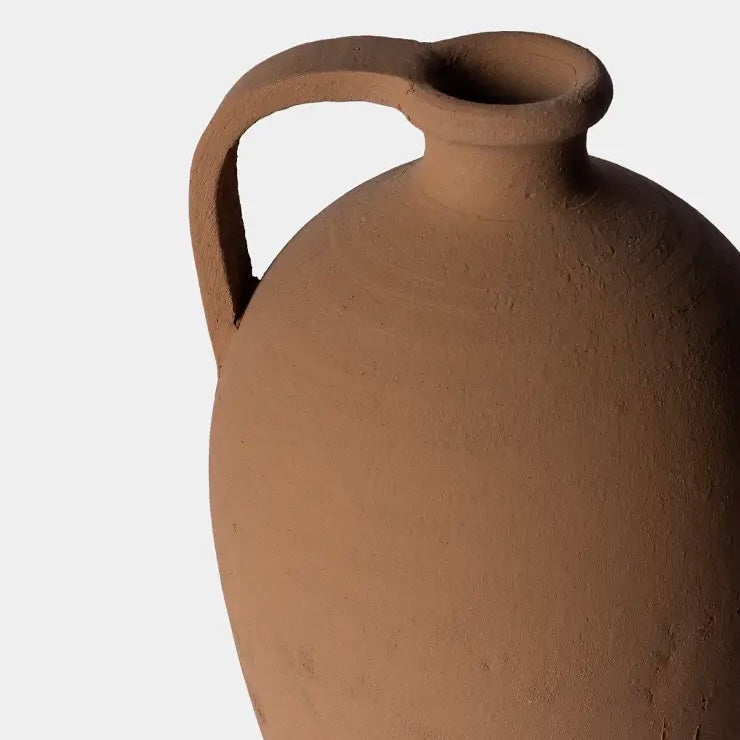 The Jug Vase entirely handmade by artisans, each piece is one-of-a-kind. Due to natural characteristics, variations are to be expected. These include but are not limited to slight differences in colors, pits, spots, and dimensions. Best styled as decorative pieces. Do not add water to the vase as it is composed of clay and will cause damage.