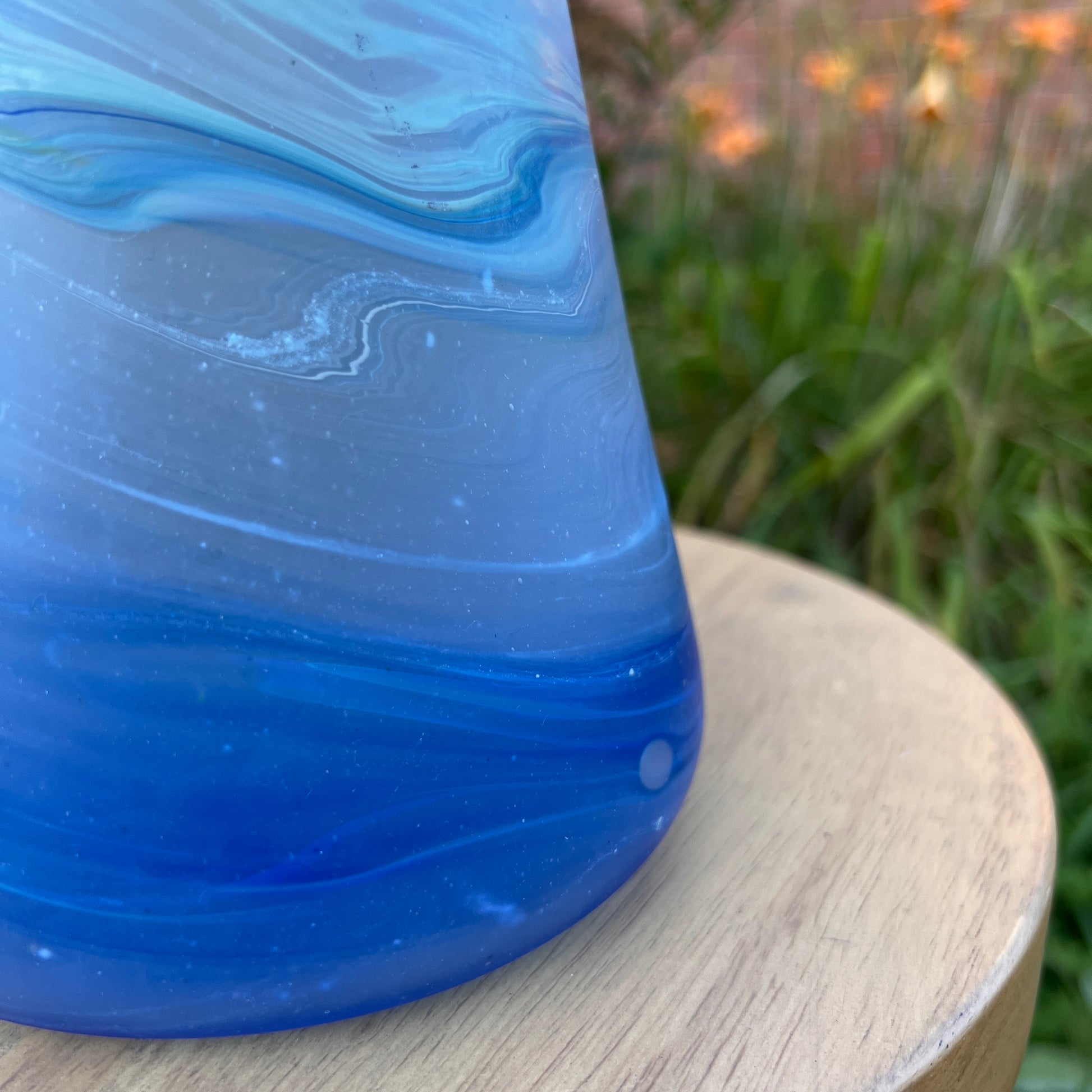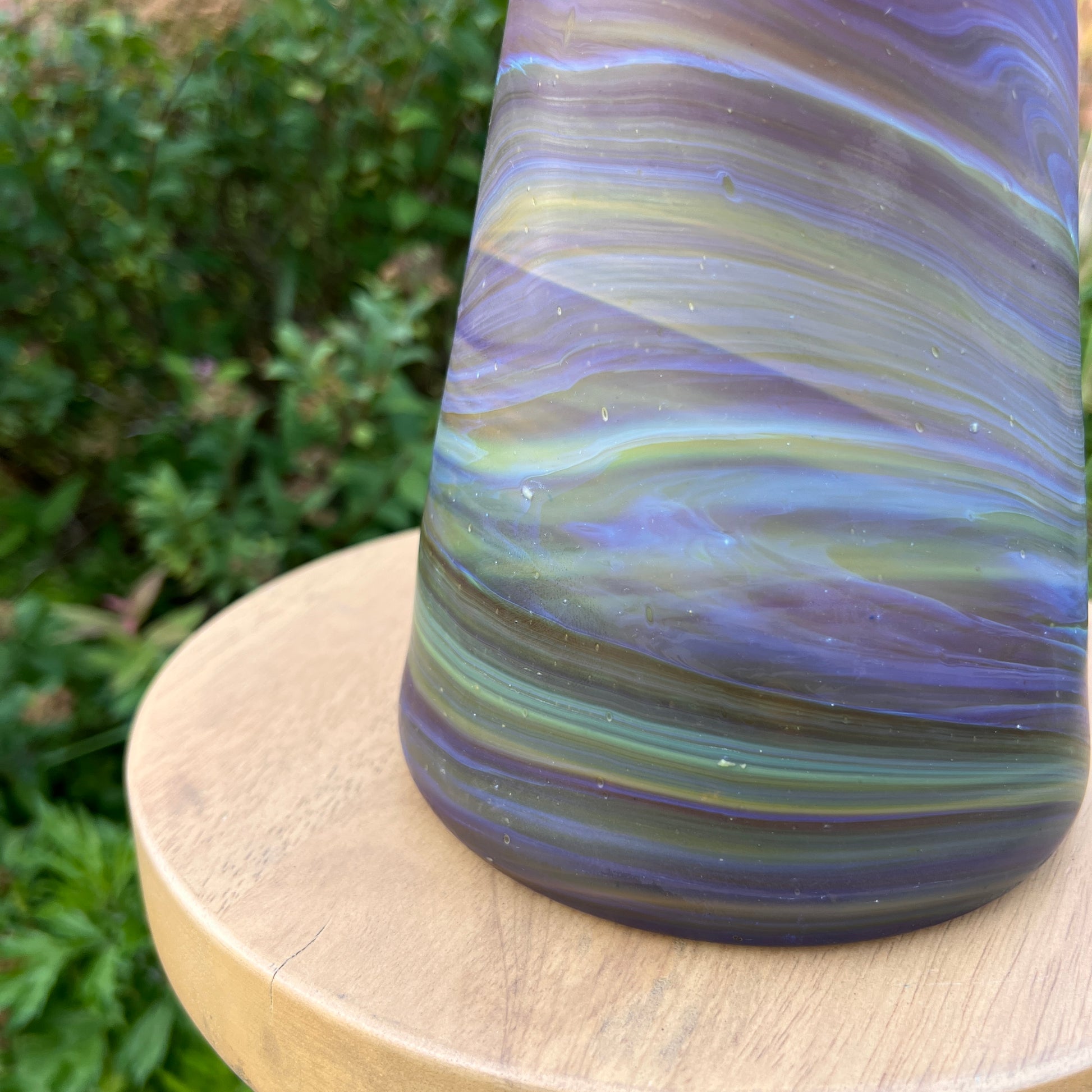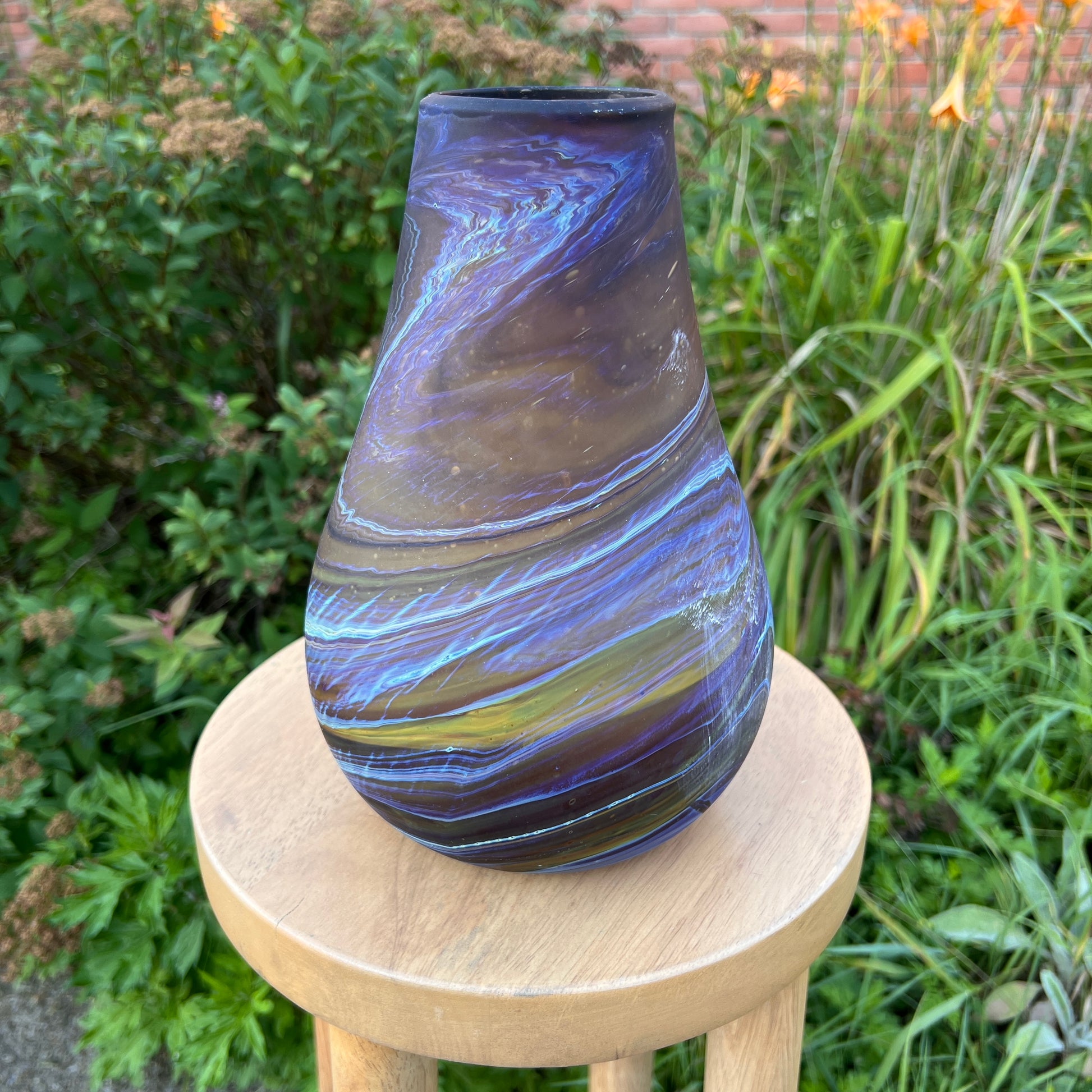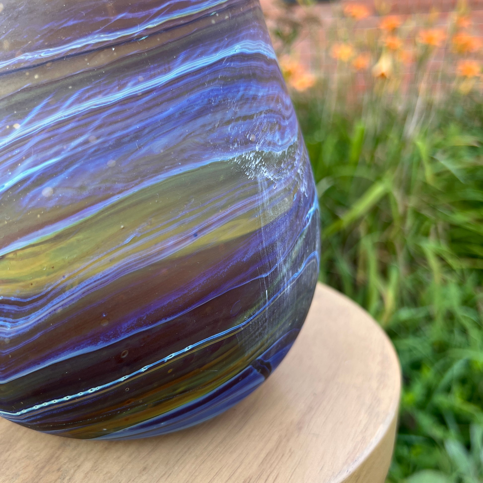 Due to the handblown nature of this glass, each is unique. Patterns and colors will slightly vary. Hand-wash only.