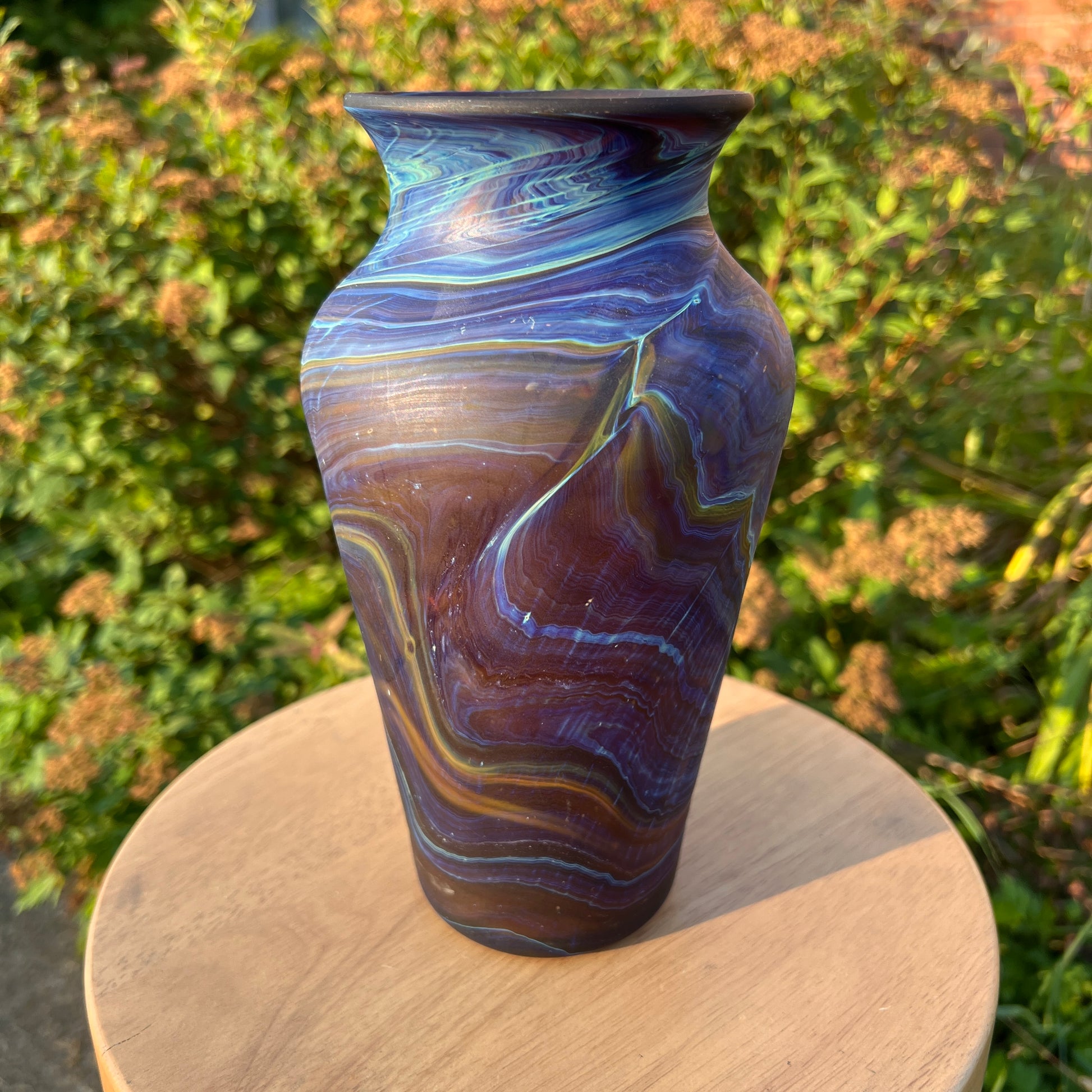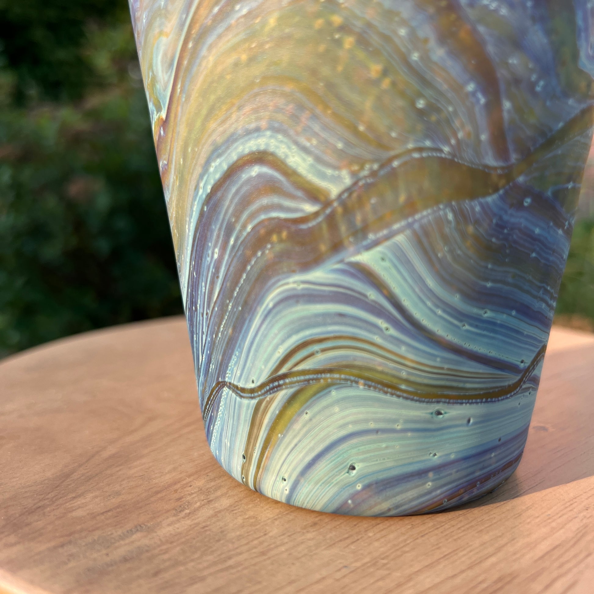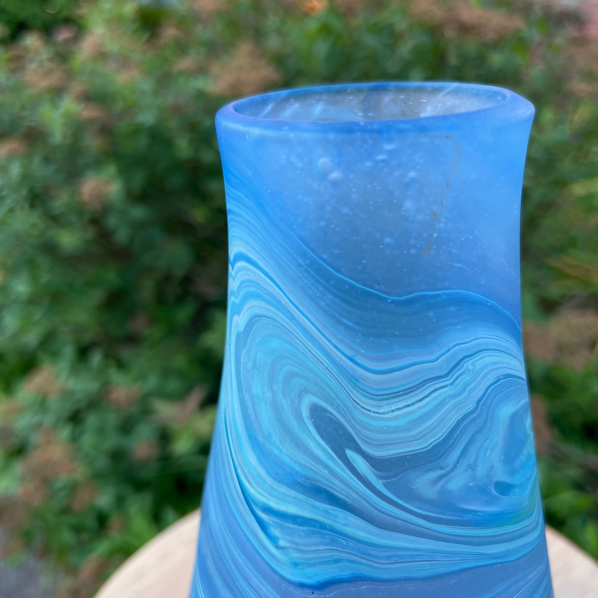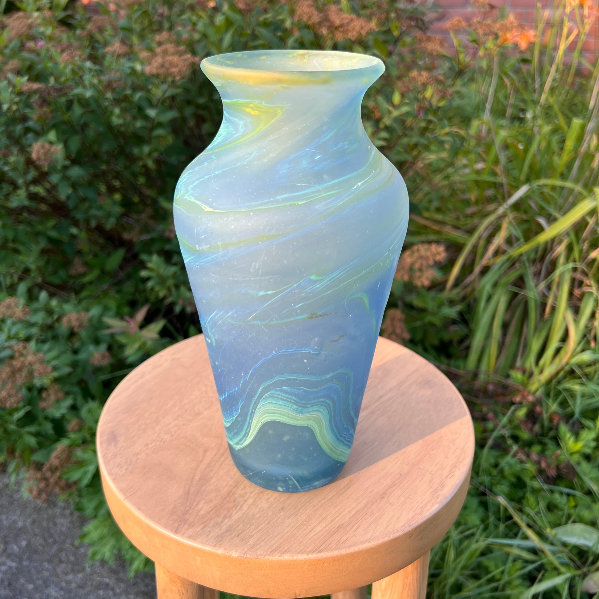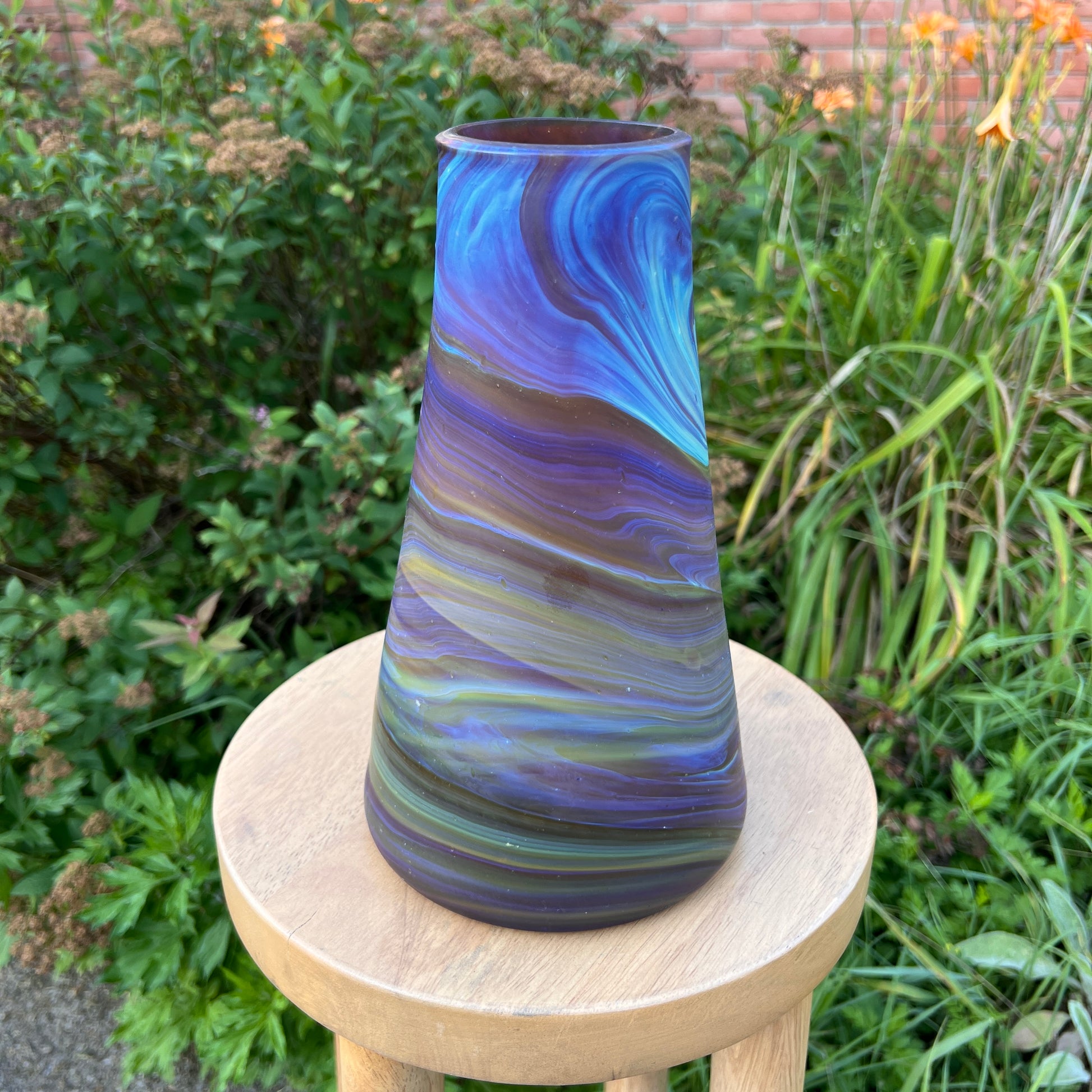 Due to the handblown nature of this glass, each is unique. Patterns and colors will slightly vary. Hand-wash only.