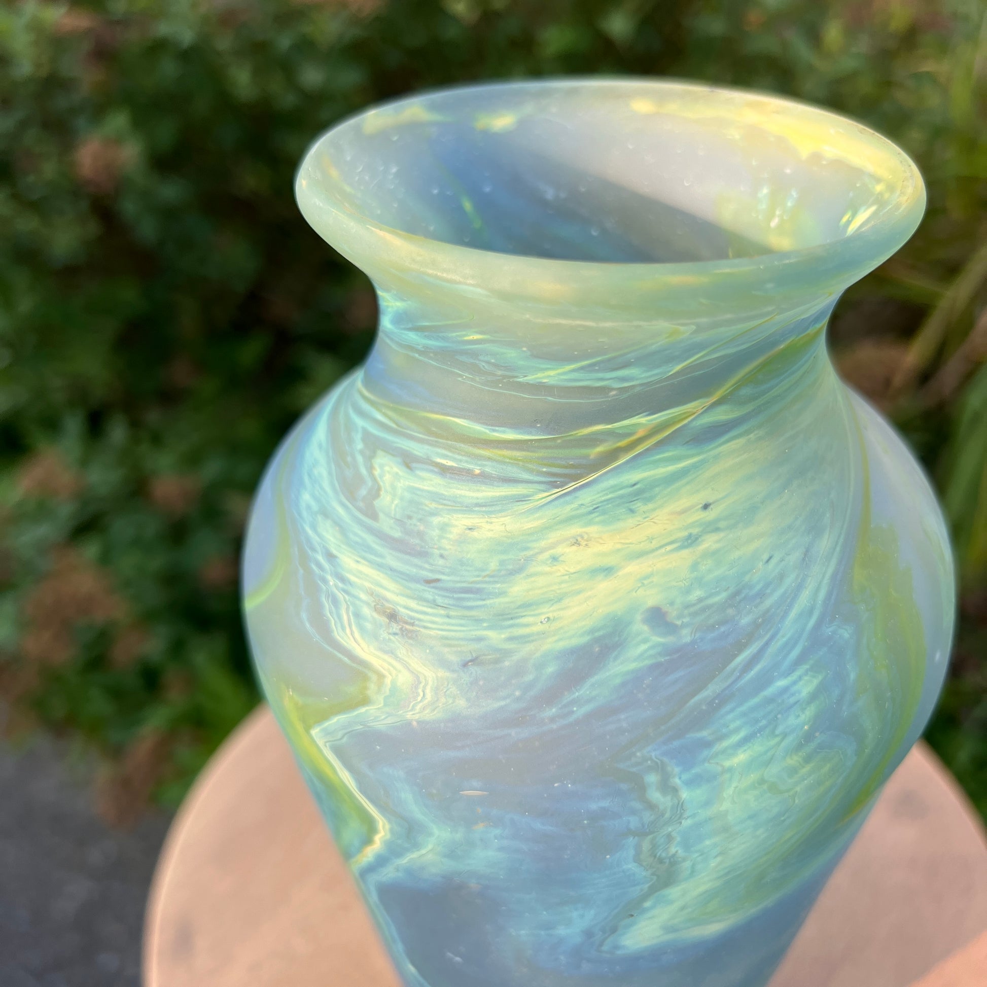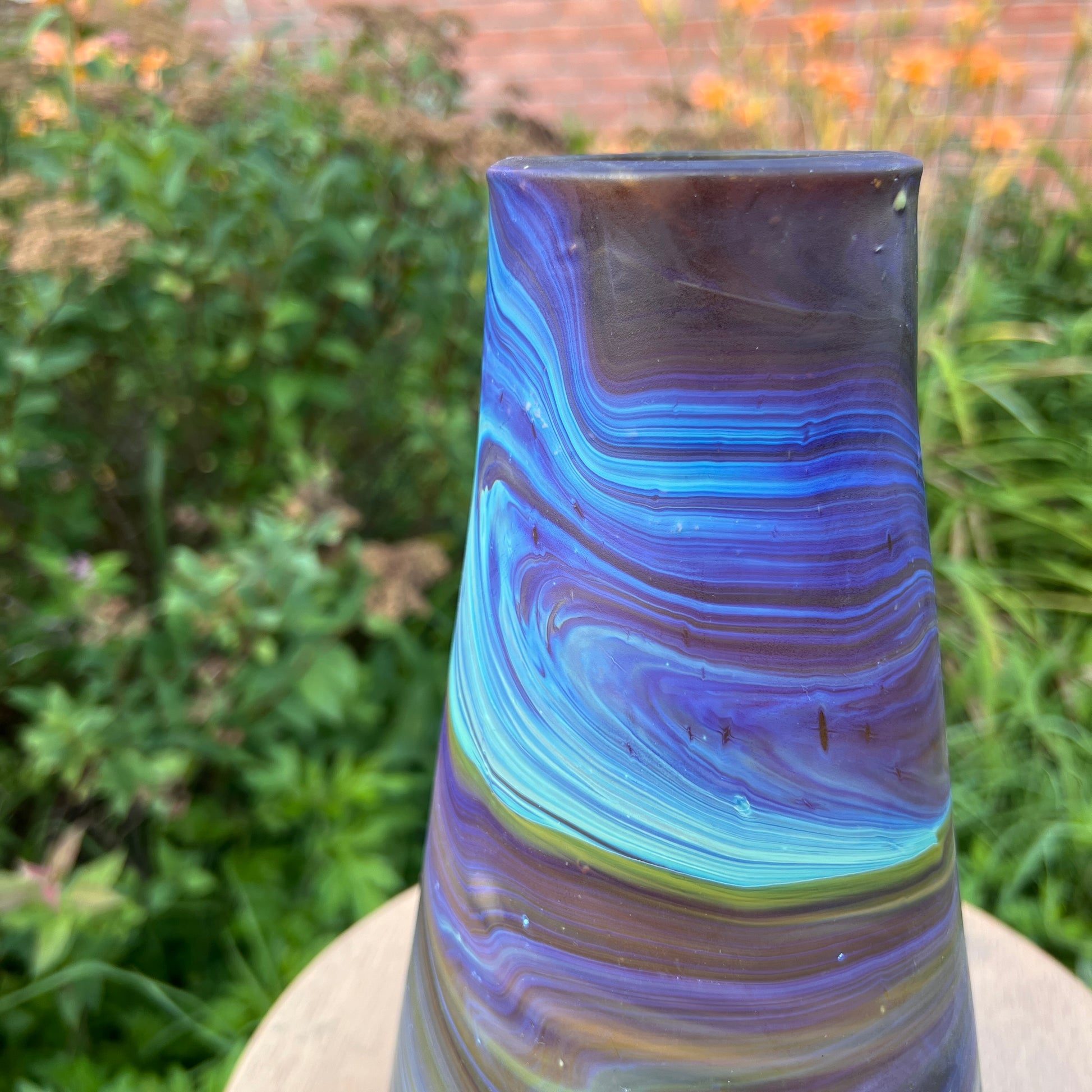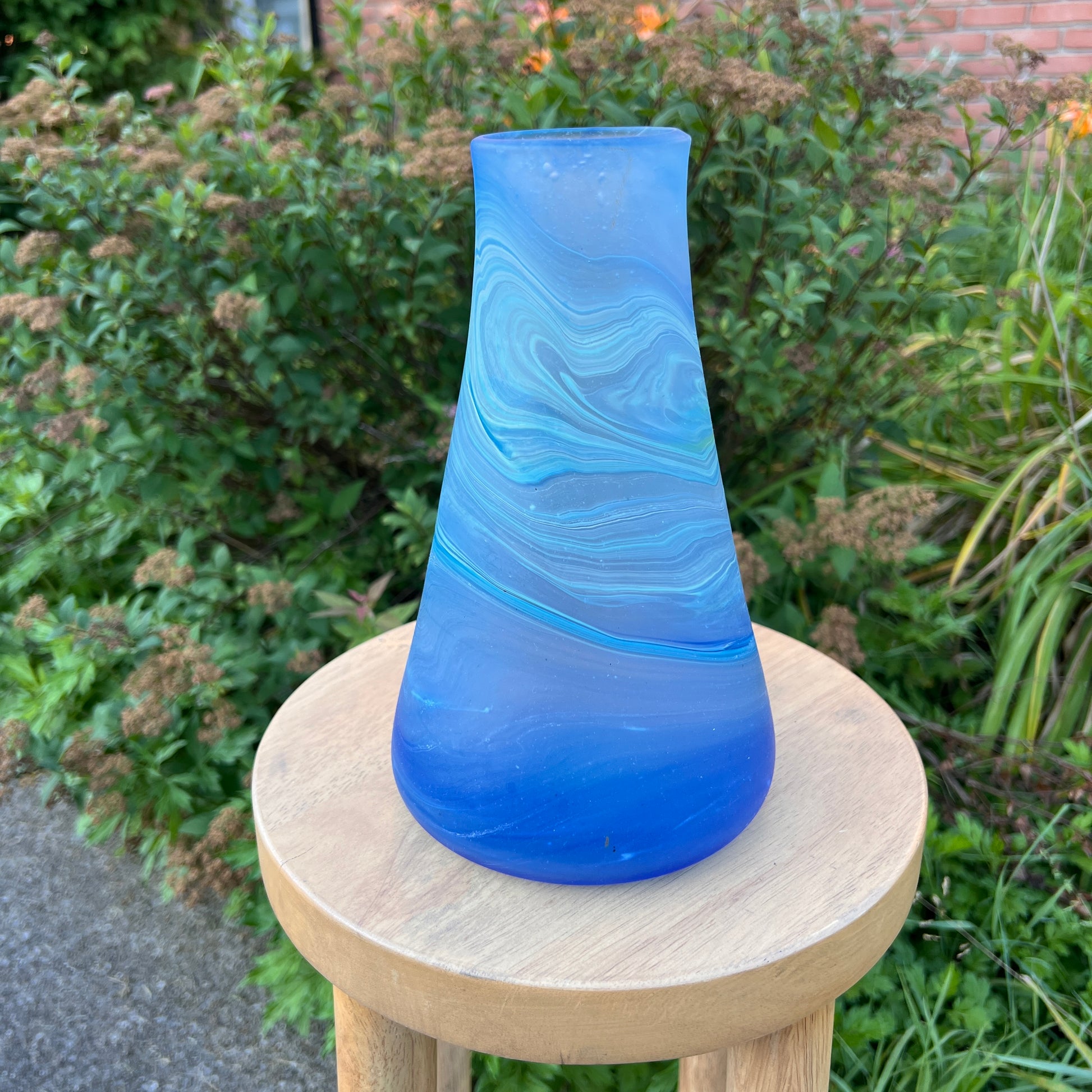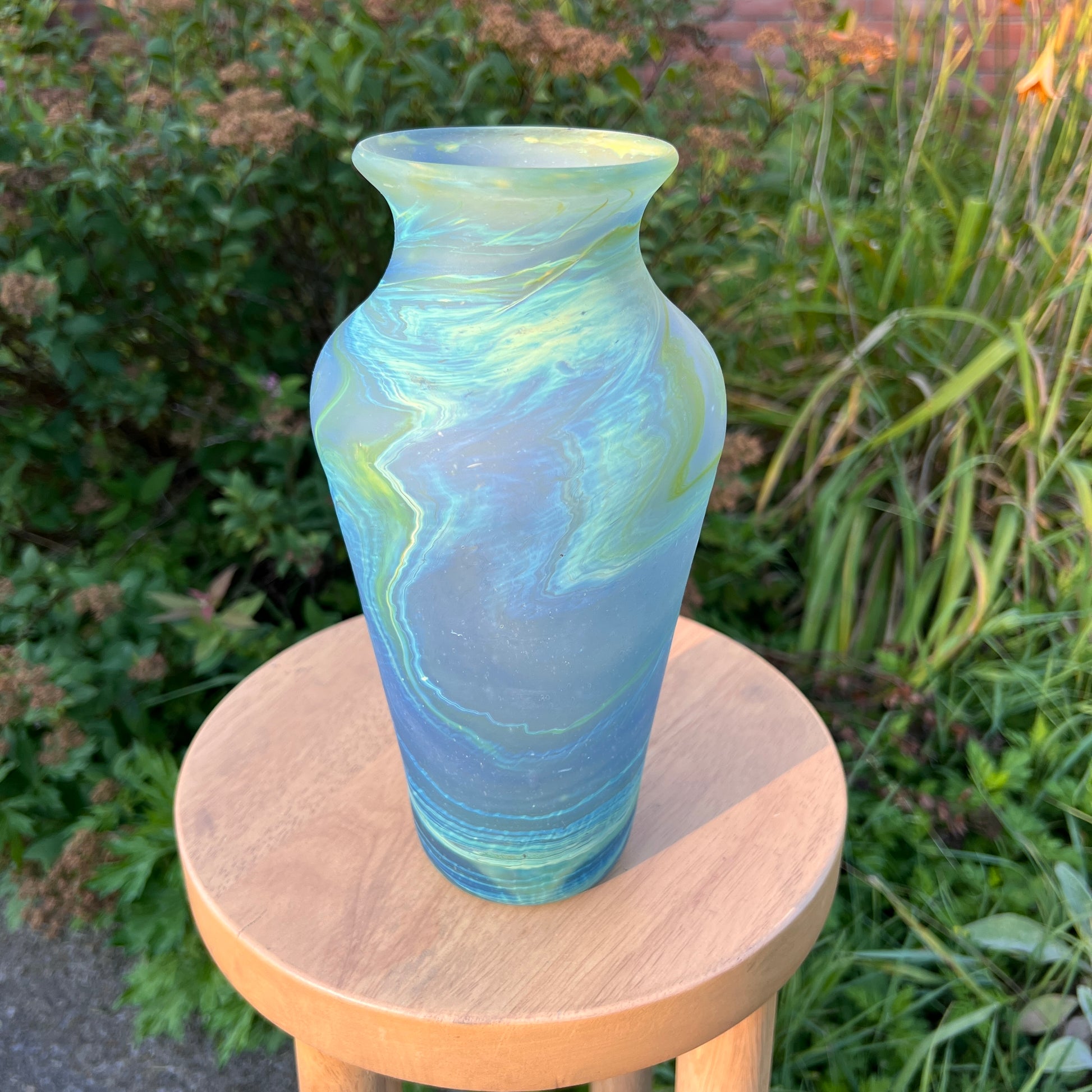 Due to the handblown nature of this glass, each is unique. Patterns and colors will slightly vary. Hand-wash only.