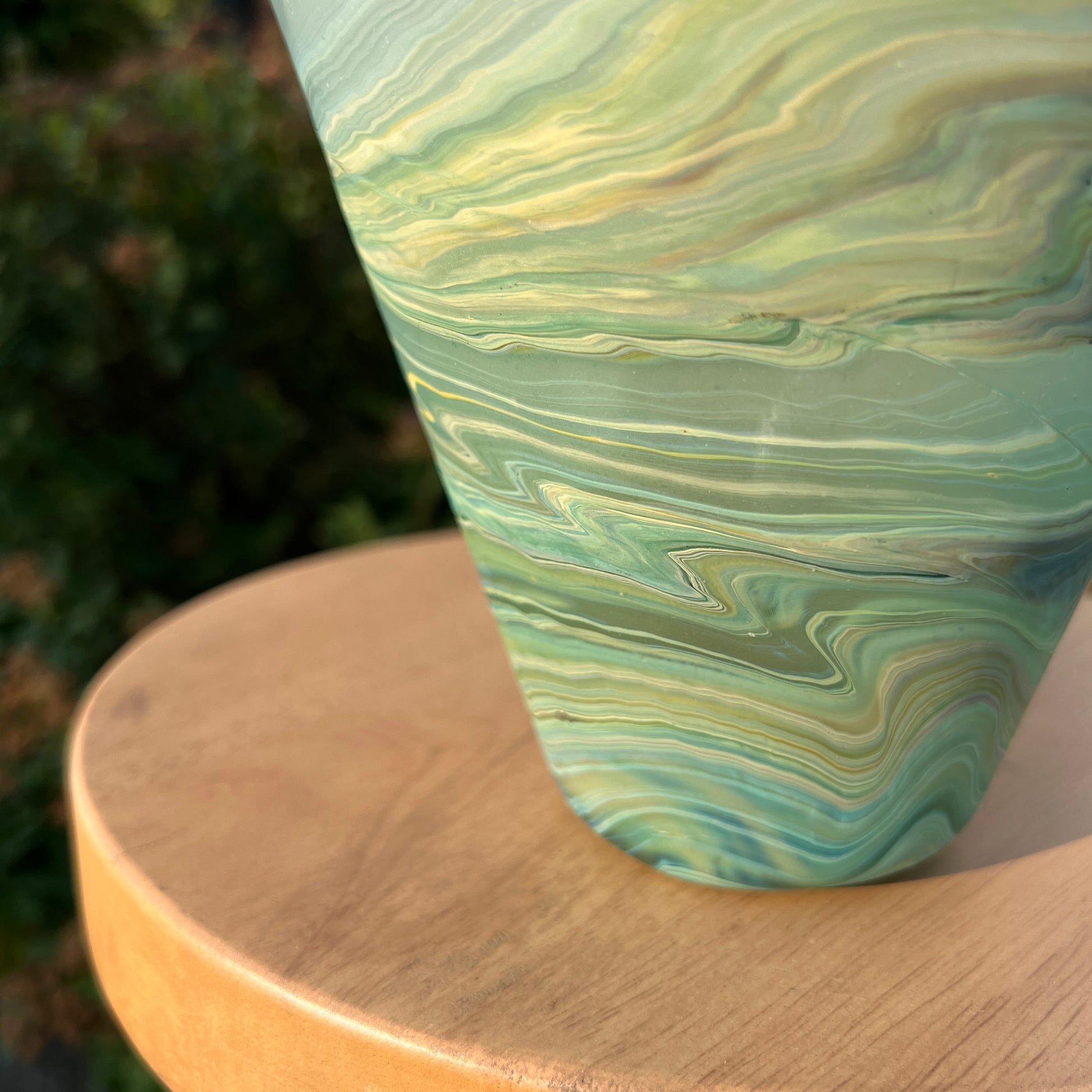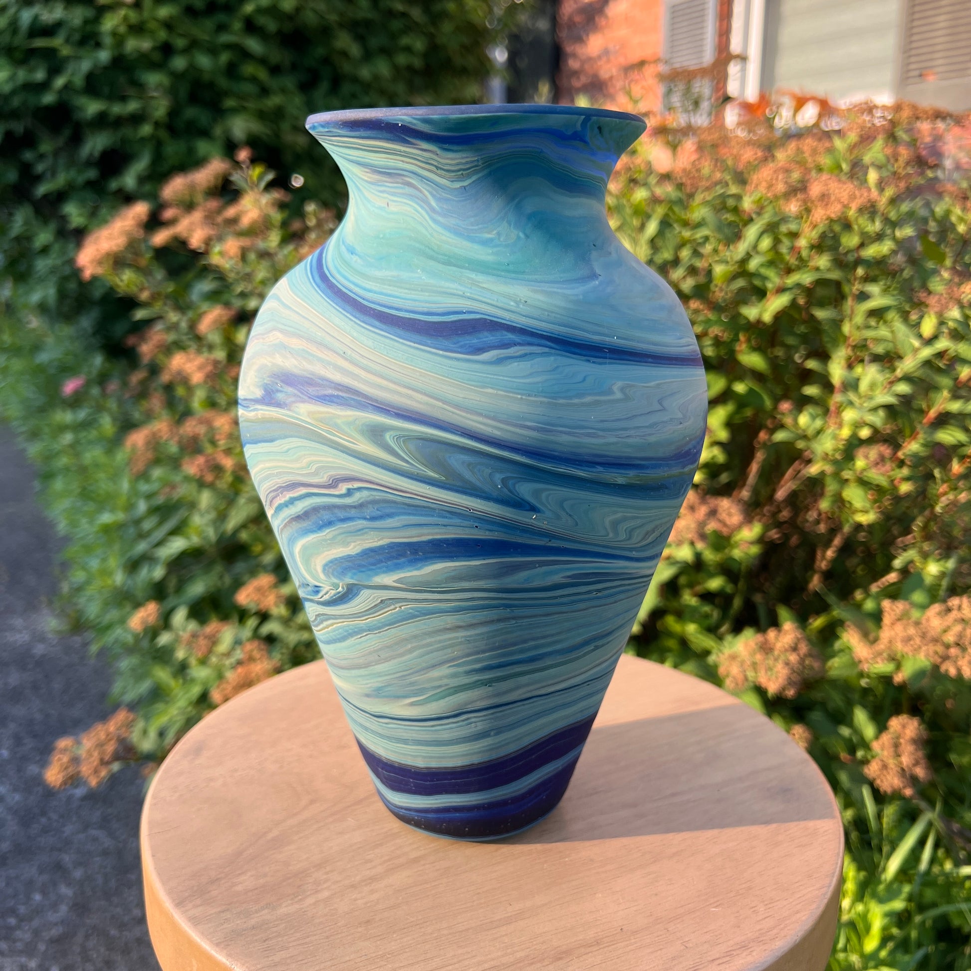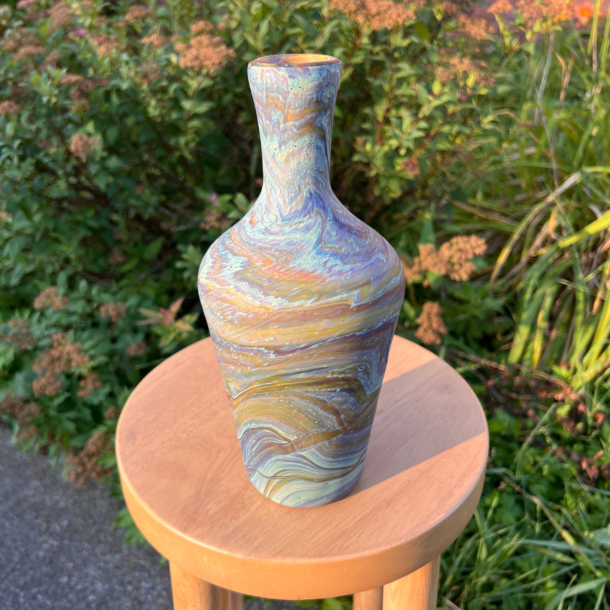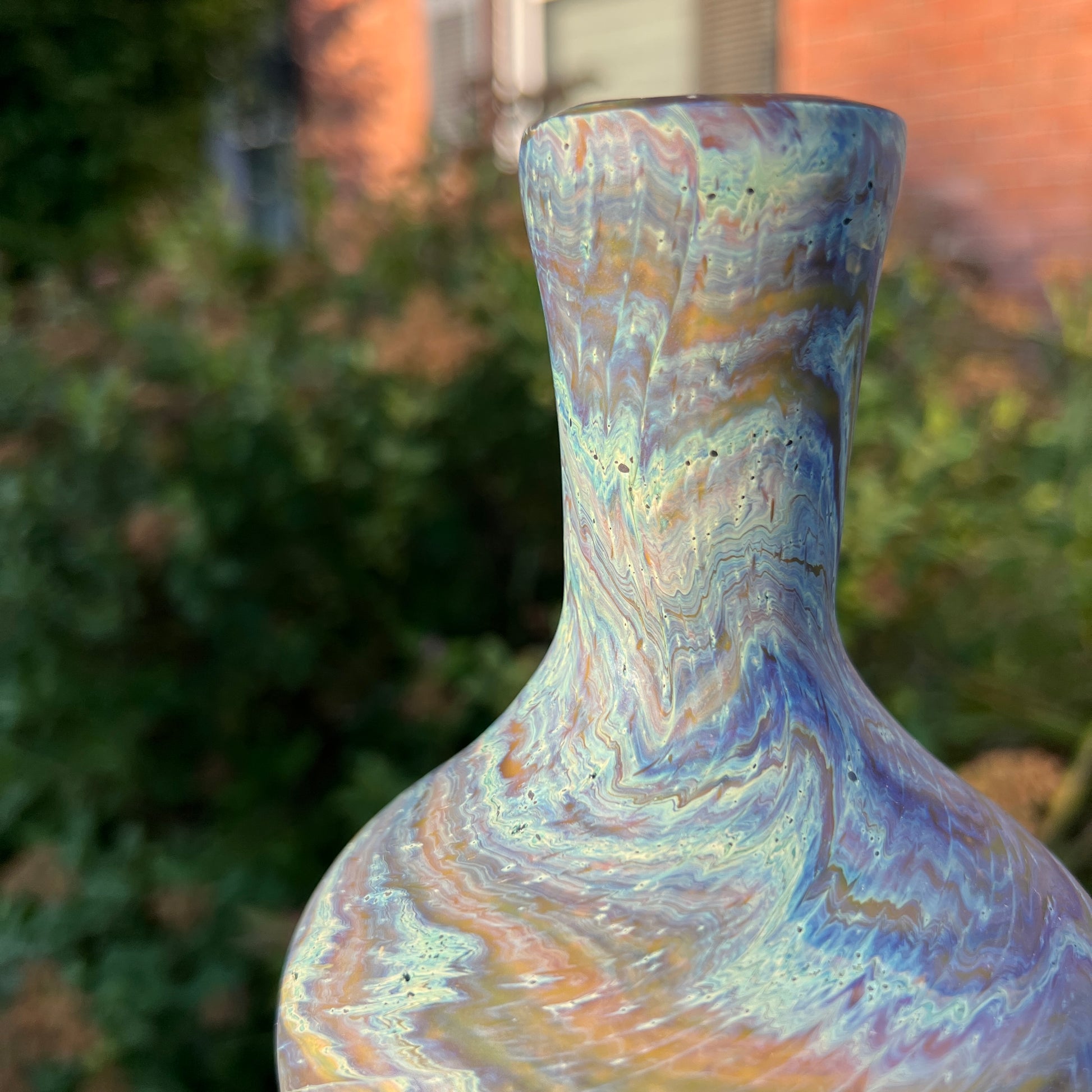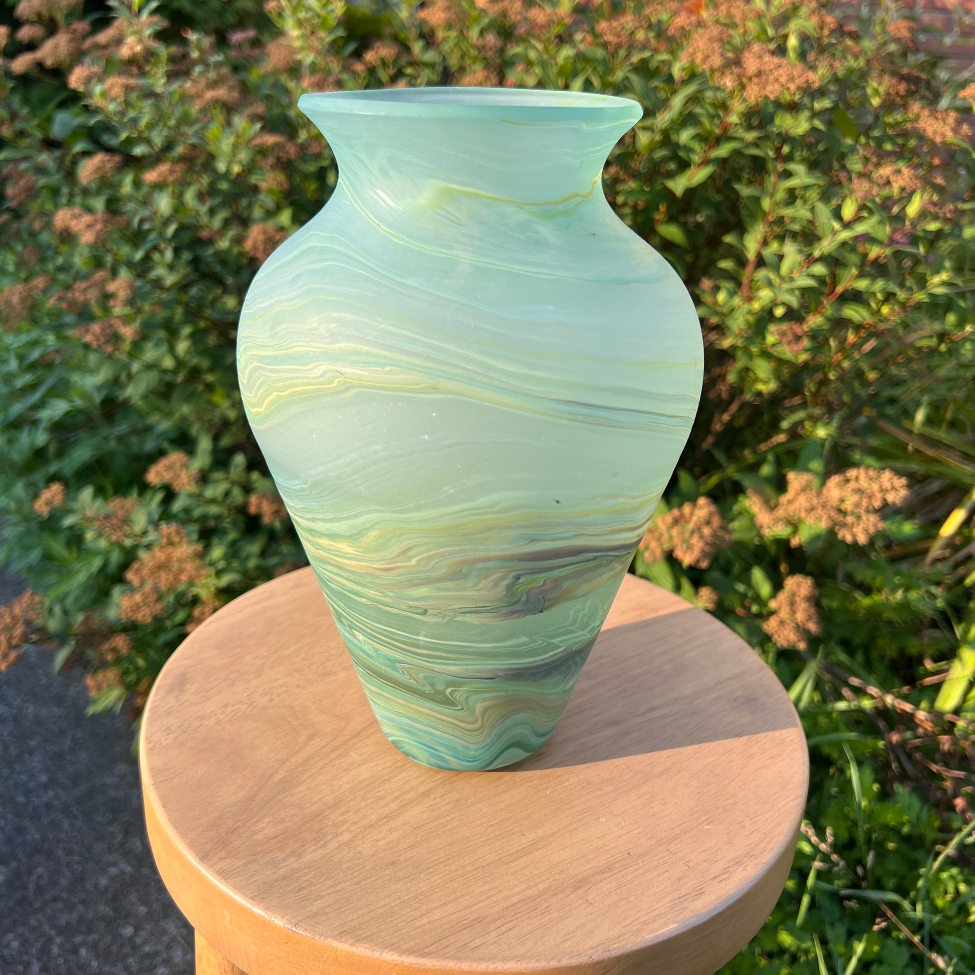 Due to the handblown nature of this glass, each is unique. Patterns and colors will slightly vary. Hand-wash only.
