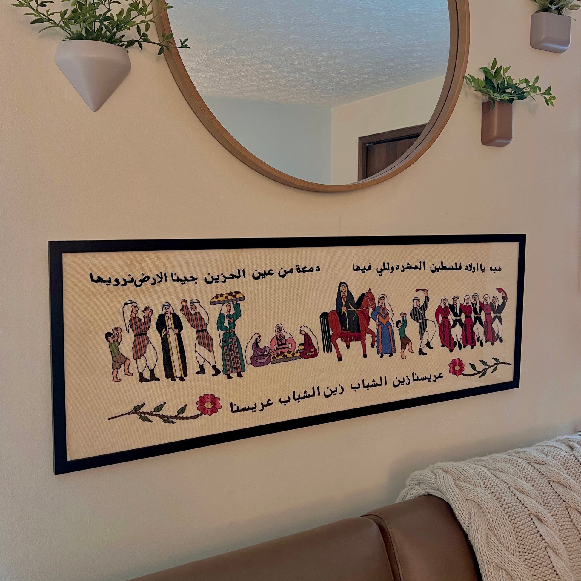 Framed Palestinian wedding scene that is hand embroidered using DMC cotton thread, on a natural colored cross-stitch fabric. It's framed in a 45x15inch black border frame.
