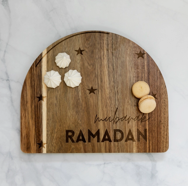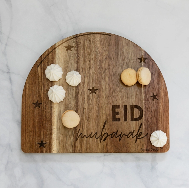Introducing the NEW, versatile and double-sided Ramadan & Eid Wooden Arch Tray. Expertly crafted from mango wood, this tray showcases a stunning Ramadan design on one side and an equally beautiful Eid design on the other. It's the perfect addition for serving food during gatherings while also serving as a stylish home decor piece. 2-in-1 has never been done so well!
