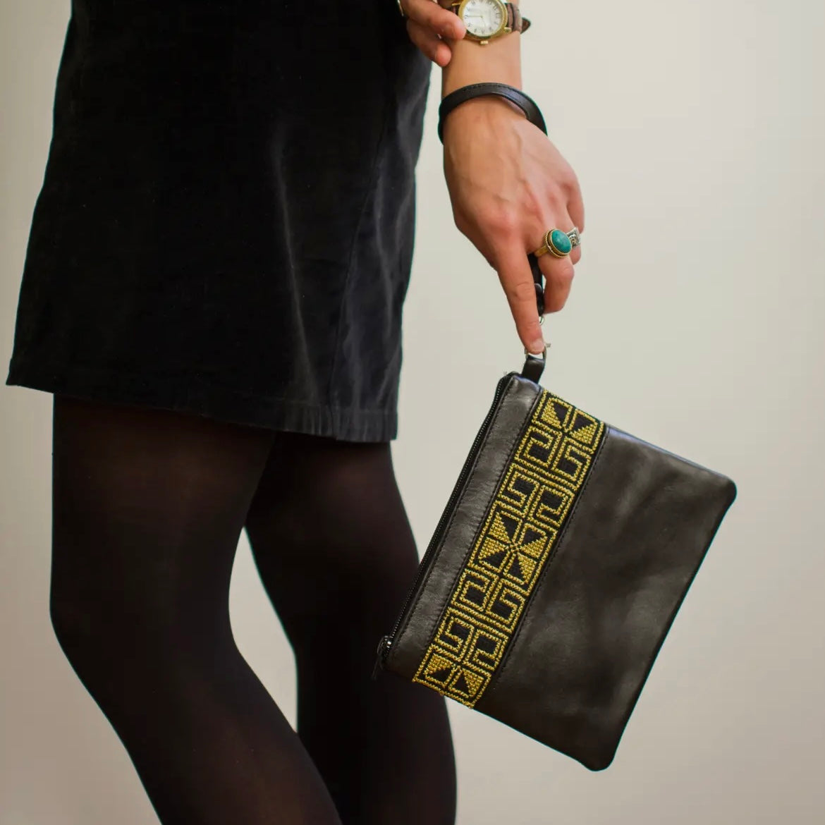 Embroidered by artisans in the West Bank. Authentic leather exterior, locally sourced goat leather from Al-Khalil