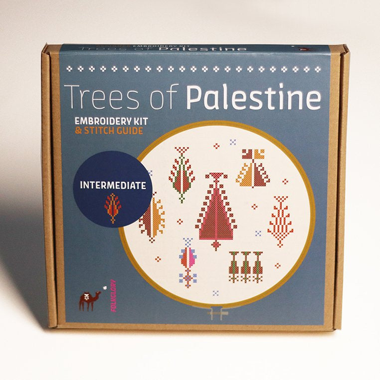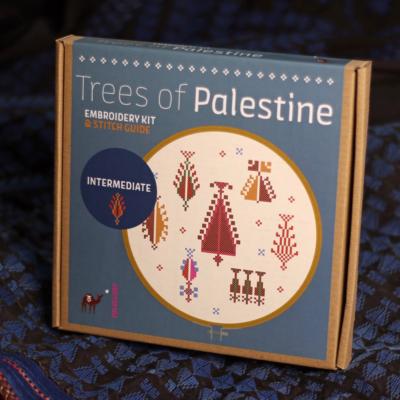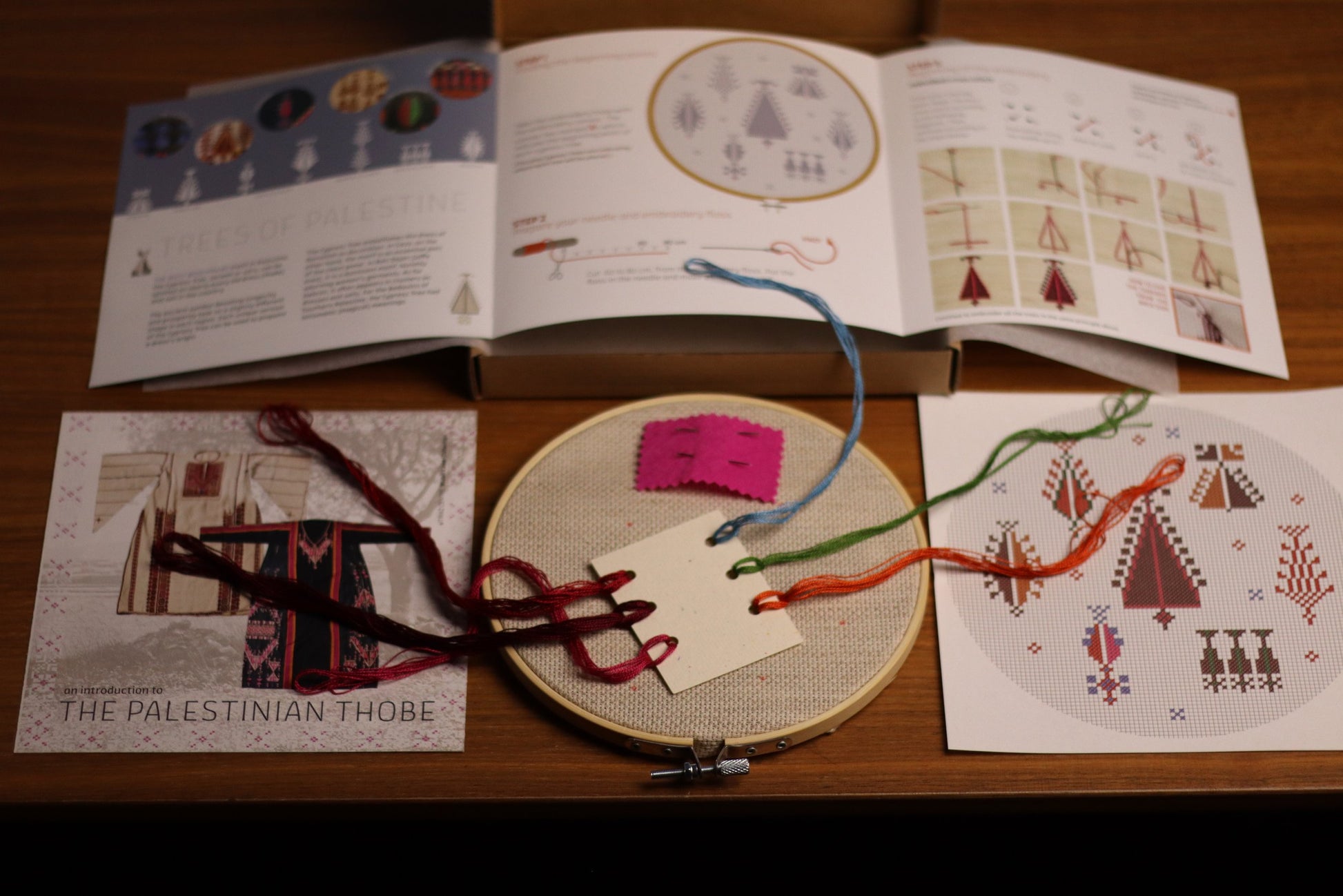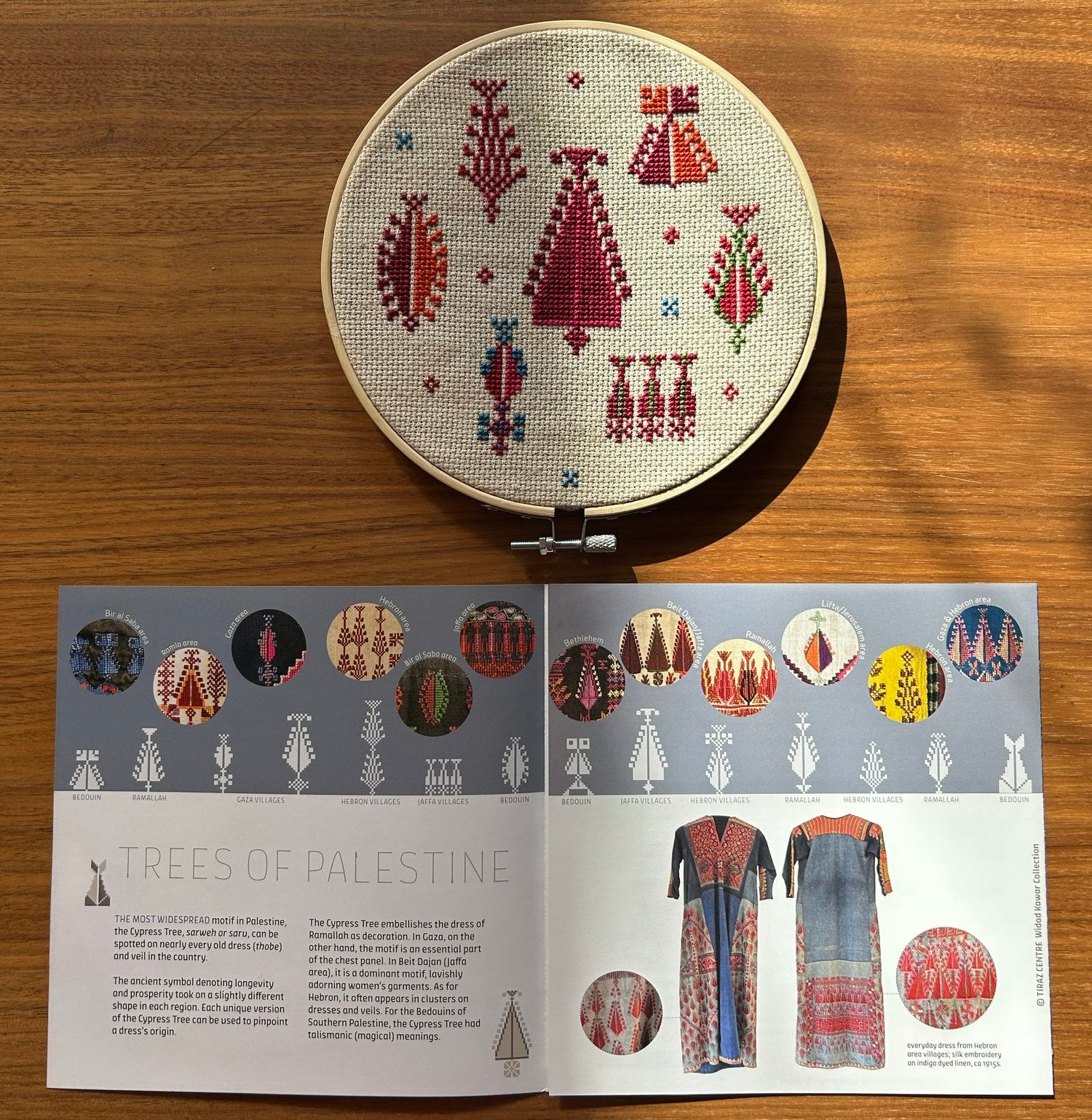 - Historic tree patterns printed on paper. The patterns are taken from dresses from Ramallah, Gaza area, Jaffa area, Bir al Saba’ and Hebron area, and 2 embroidery tapestry needles.