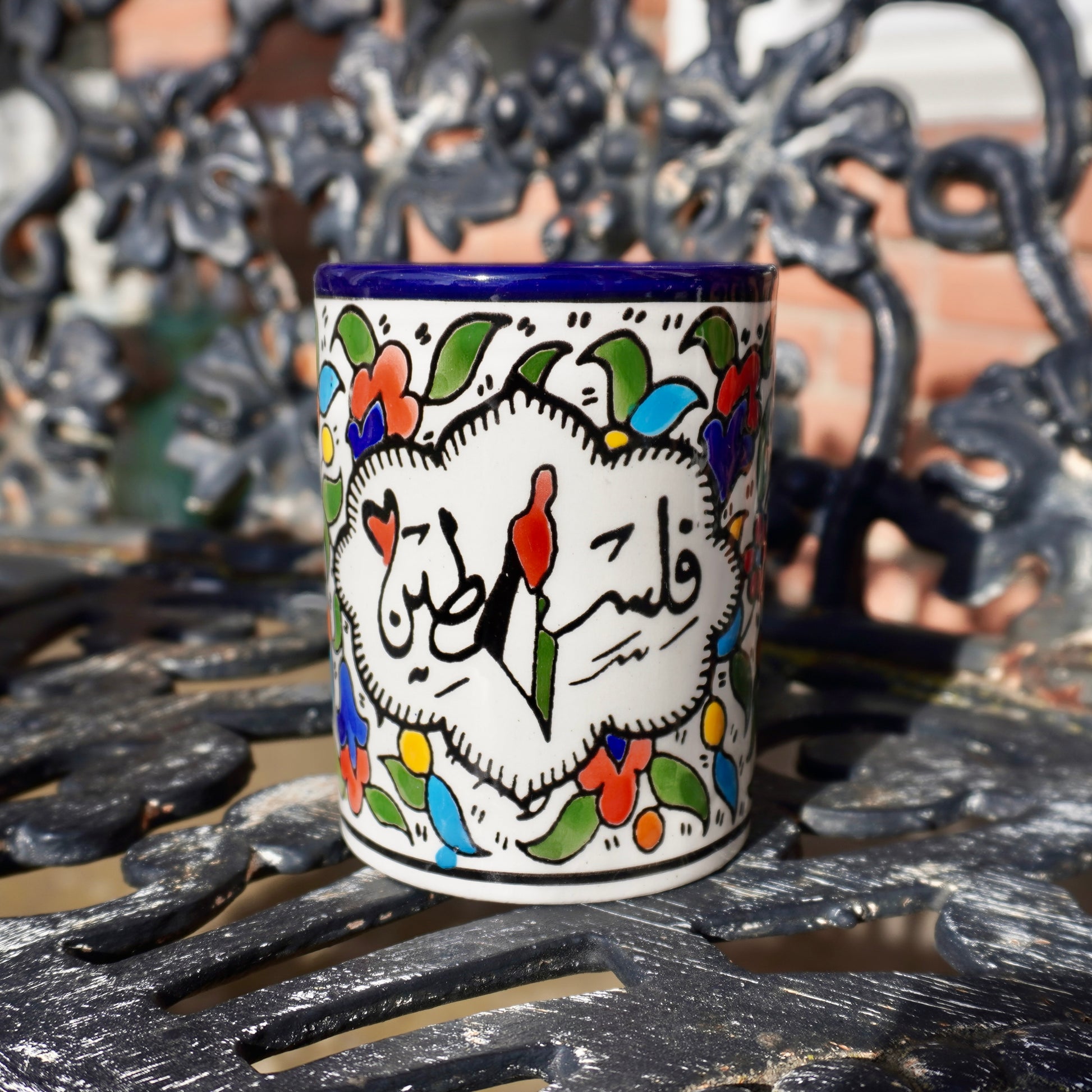 Multicolor floral mug with (فلسطين) which translates to: Palestine (Falasteen) featuring the map colored in as the Palestinian flag.